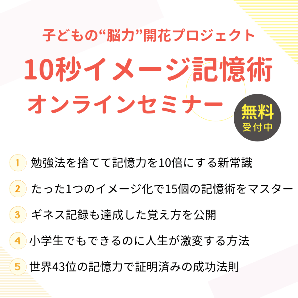 暗記が苦手だった僕が、独自の脳科学・記憶術を体系化し、誰でも短時間で成果を出せる「10秒イメージ記憶術」を開発。記憶力の日本一決定戦では「記憶力四天王」として出演。現在では、お子さんの隠れた才能と脳力を引き出し、正しい努力で自信をつけさせる専門家として活動しています。